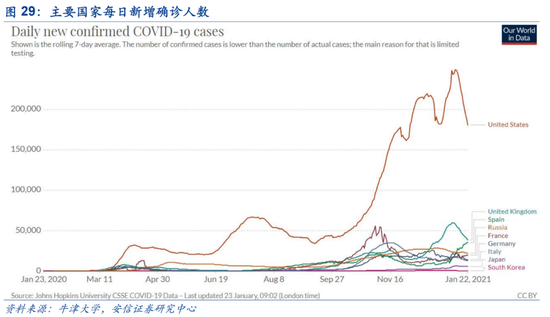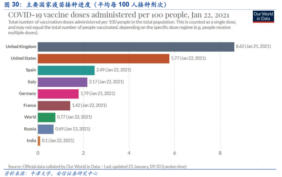 根据美疾控中心的数据,截止美国时间1月15日,美国已完成近3982万剂疫苗的分发,已有近1911万人至少接种了第一剂疫苗;接近原政府承诺于20年末完成2000万人接种的目标,近期处于平缓加速。目前来看,英美等发达国家疫苗接种速度仍然偏慢,若按当前速度和75%的接种率计算,疫苗接种时间大概在一年左右。