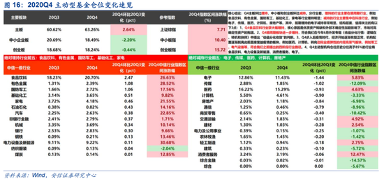 Q4机构仓位特征:机构持股集中+顺周期。截止1月22日,2020年基金四季报基本披露完毕。在此,我们以主动型基金为样本对Q4机构仓位进行观察,发现Q4主动型基金机构配置环比增持主板,环比减持中小板和创业板。分行业看,增持的行业主要在顺周期行业,增持靠前行业有食品饮料,有色金属,国防军工,基础化工,家电等行业增持明显;减持的行业主要集中在科技和医药行业,减持靠前行业有电子,传媒,医药,计算机,房地产等。其中,前期增持的电子减持非常明显。值得注意的第一个特征是:Q4有色、化工、机械、汽车等顺周期板块进一步增持,金融板块呈现边际持续增持迹象,“制造业回归”得到了充分印证。值得注意的第二个现象是Q4以食品饮料大幅增仓为代表的机构持股集中现象。Q4食品饮料行业获大幅增持,核心原因是在基金大规模发行的机构化背景下,机构投资者面对优质资产稀缺和外部不确定性加剧而对高确定性资产的持股集中。以安信策略——A股个股估值分化指数进行观察,可以看到其从2020年9月的低点11%一路上行至12月末达到22%,上涨近一倍。