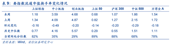 换手率环比有所下降,主板仍处于历史相对高位,中小板仍处于历史相对低位。本周上证综指,中小板指,创业板指,上证50,沪深300,中证500,万得全A的流通市值换手率分别为1.18%,3.59%,4.68%,0.68%,1.07%,1.86%,1.54%,分别较前周变动-0.16,-0.49, -0.20,-0.14,-0.20,-0.29,-0.18个百分点,分别处在82%,35%,29%,89%,88%,68%,78%分位数水平。