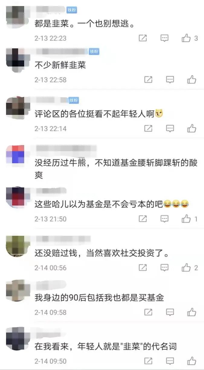 如何看待年轻人纷纷下场“养基”?评论区里,老基民的嘲讽技能拉满:“没经历过牛熊,不知道基金腰斩脚踝斩的酸爽”“在我看来,年轻人就是‘韭菜’的代名词”“都是韭菜。一个也别想逃。”