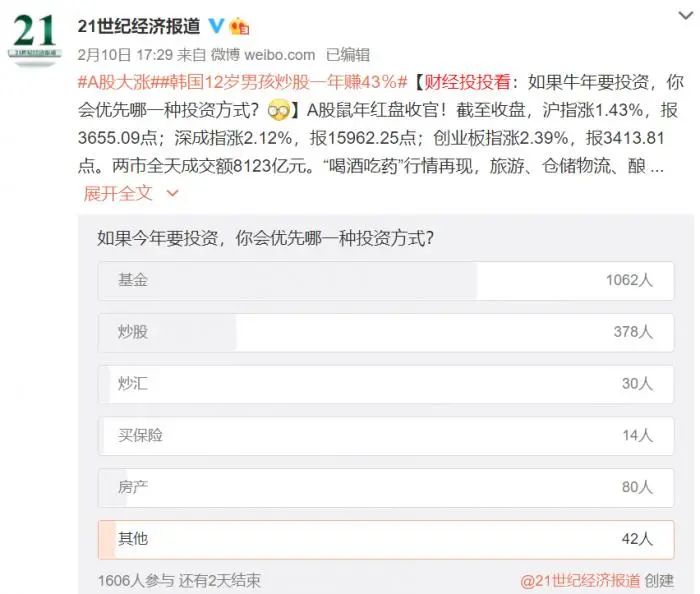 相比之下,基龄5年的小B则冷静许多:“年前涨的有点疯,我总觉得年后情况不太好。可能会看情况适当调仓。”此外,身边还有不少朋友正蠢蠢欲动:“最近有什么好的基金?给推荐下呗。”21网调君不禁思考:全民“养基”时代真的到来了吗?