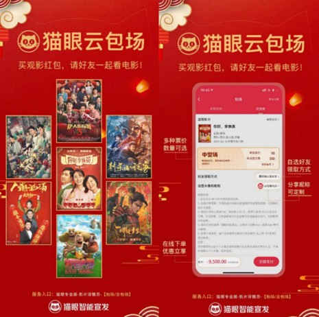 作为猫眼首创的智能宣发产品,云包场可以跨地区和跨时间实现“一键包场”,在满足观众社交观影的基础上,某种程度上也能实现用户情感维系; 而助力主创红包,则为用户提供了“应援出口”。此外,乐事薯片、广汽丰田凯美瑞、白酒品牌贵酒匠等与猫眼“云包场”达成合作,品牌方和广告主的进入,也让电影和其它产业的联动有了新的可能性。