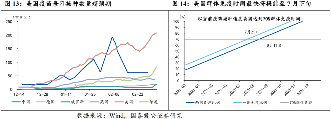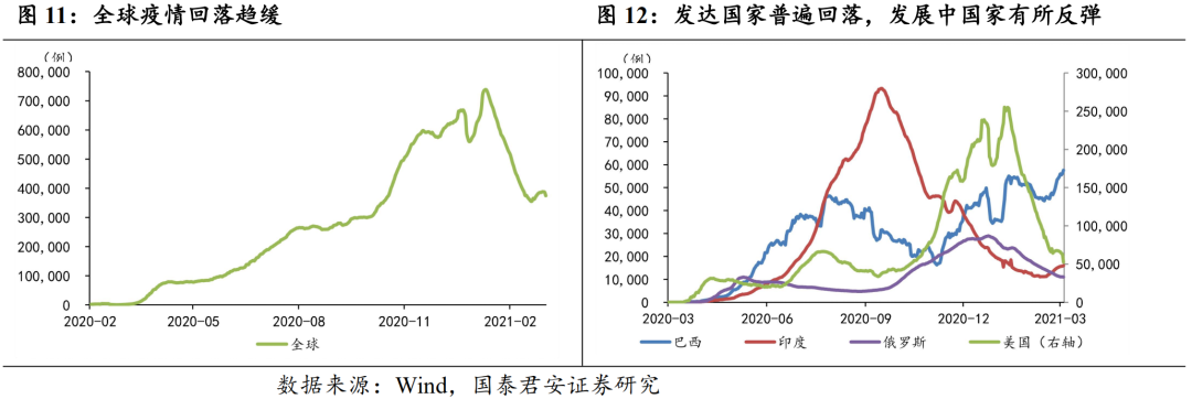 (1)疫情和经济复苏角度,疫苗接种超预期叠加刺激政策落地,全球经济有望共振上行。全球单日新增在1-2月快速回落后,当前有小幅反弹的迹象,与病毒变种、海外生产端修复均可能有关。对于变异病毒,各国重视度较高,变异病毒重新大范围传播的概率有限。对于生产修复带来的疫情反弹,随着美欧等发达经济体疫苗接种的推进,疫情对复工的阻碍将持续减弱。在疫情整体可控的背景下,美国财政刺激大概率3月中旬落地,将进一步提振美国居民耐用品消费支出,推动美国经济复苏。受益于海外地产复苏,地产后周期如家具、家电类产品出口景气有望持续。
