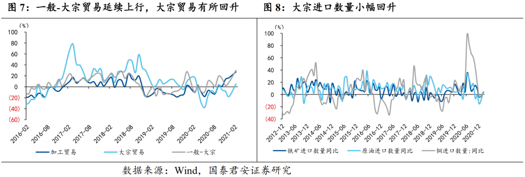 1)进口上升主要受一般贸易以及大宗贸易改善支撑。一般贸易修复与内需和海外产能修复逻辑一致,而大宗贸易则主要源自大宗商品的涨价。