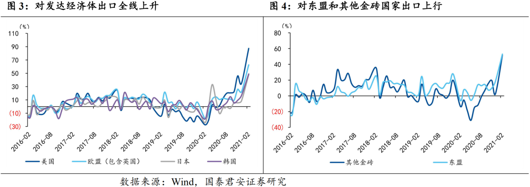 对新兴市场出口方面,对东盟和其他金砖国家出口均大幅增加,新兴市场出口占比保持平稳。1-2月对东盟出口增速为53%,占比为14.4%,低于20年同期的15.1%,但高于19年同期的13.2%。对金砖国家出口增速为51.8%,占比为7.2%,低于20年同期的7.6%,与19年同期持平。整体来看,1-2月出口超预期主要得益于发达经济体的出口,尤其是对美国出口的表现。