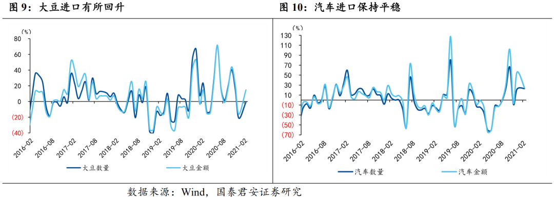 大宗的细分产品中,数量角度,1-2月原油进口回正至4.1%,铁矿、铜材也同步出现回升。农产品方面,1-2月大豆进口降幅收窄至-0.8%,汽车进口在12月明显回升后维持平稳。