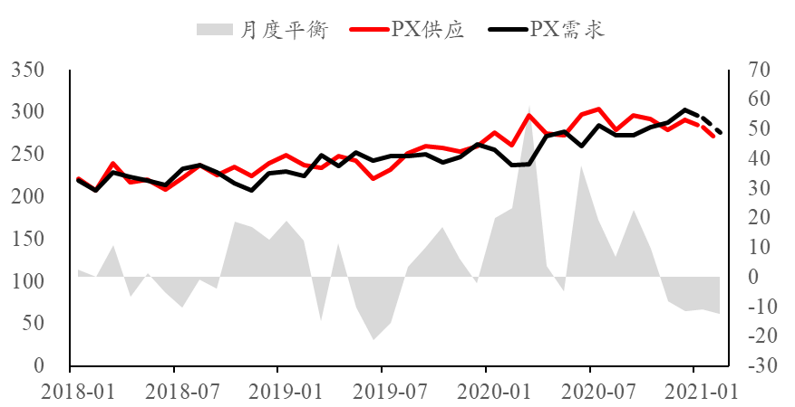 2月下旬PTA快速上行,春节假期后涨幅一度达到23%。这一波上涨很大程度上来自上游PX加工费快速修复带来的成本端推动。PX自2020年二季度末起加工费持续承压,PX-石脑油价差长期在200美元/吨以下运行,导致多数PX工厂处于亏损状态。四季度起,部分PX工厂长期停车带来PX供应缩量,叠加PTA新装置投产,PX供需格局转向紧平衡;而二季度PTA新装置投产预期带来显著的需求增量,下游厂商希望锁定成本导致2、3月ACP合约价相继谈成,对PX利润产生了进一步提振。2月中下旬,PX-石脑油价差一度达到300美元/吨以上,PX厂商获得了良好的利润空间。