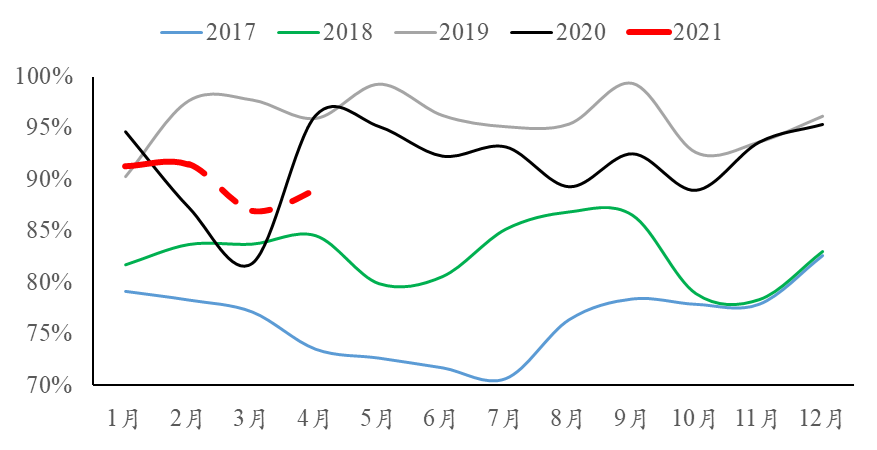 本轮聚酯产业链的整体上涨,一个重要的驱动是市场对上半年需求恢复的预期。不过前期原料市场的剧烈波动,似乎使产业链下游的运行受到了一定的阻碍。原料价格暴涨暴跌下,下游织造厂商接货谨慎,涤丝产销快速萎缩。不过前期冬季及出口需求旺盛下,涤丝库存压力尚可,旺季预期下涤丝厂商信心也相对较足,在原料端大幅跌价的情况下涤丝价格仍旧坚挺,而并不希望降价走量。终端方面,坯布库存逐渐走低,成交情况虽然显著高于2020年同期水平,但能否达到未受疫情影响的2018、19年水平还有待进一步跟踪。从目前态势来看,下游整体运行相对健康,如果终端订单可以持续,那么自上而下涨价传导的全流程得以打通,那么上游原料端的利润仍然存在修复的可能。反之,则可能倒逼涤丝降价出货,带来上游原料端价格的进一步下跌。