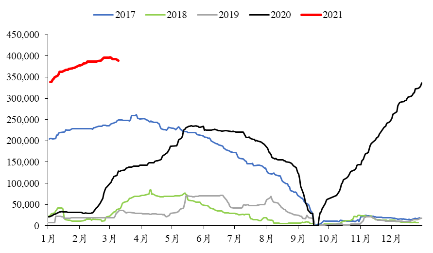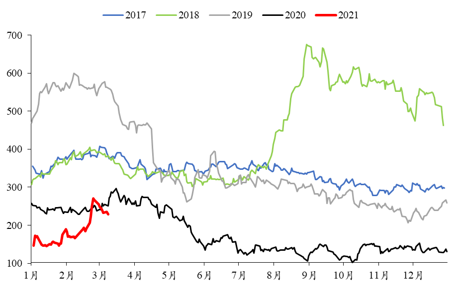 从供给端来看,2月各PTA厂商陆续公布的检修计划逐步落地,目前国内PTA装置平均负荷已经下降至73.4%附近。如果目前各家厂商公布的检修计划全部兑现的话,预期将给3-4月带来月均35-40万吨的供应缩量。考虑到下游聚酯端负荷恢复迅速,在新装置投产前,PTA中期供需格局将维持良好状态。春节过后PTA2105合约基差自-152元/吨持续走强至-59元/吨,也体现了市场对后市供需格局的预期。