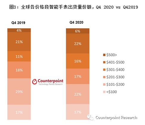 原标题:Counterpoint:2020年全球智能手表出货量同比增长1.5%,预期未来两三年平均售价仍将走高