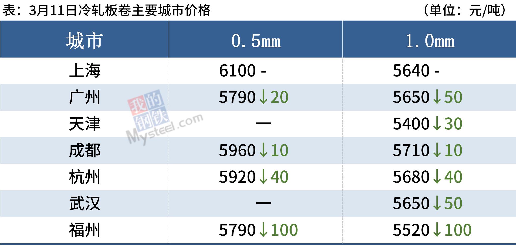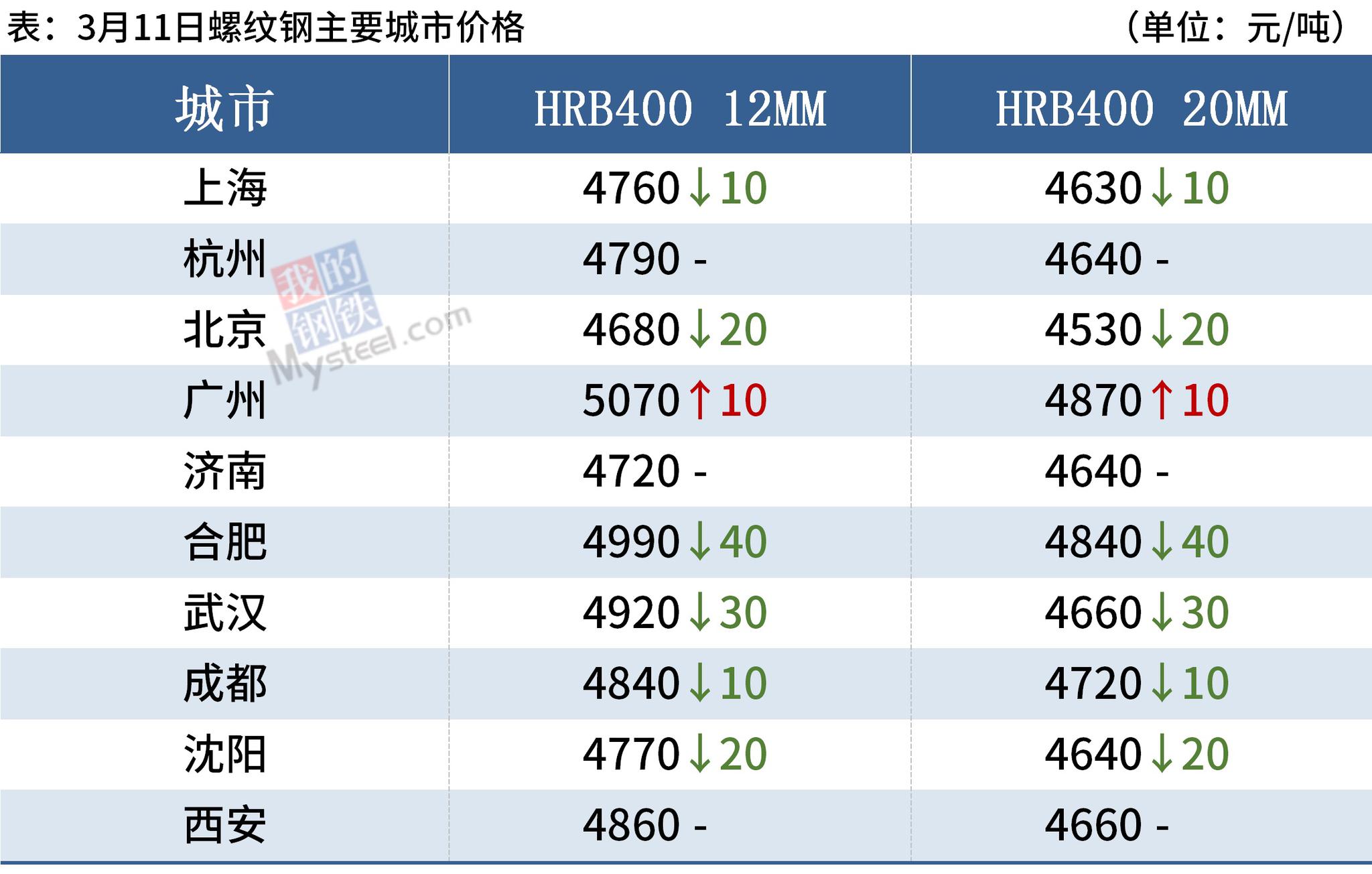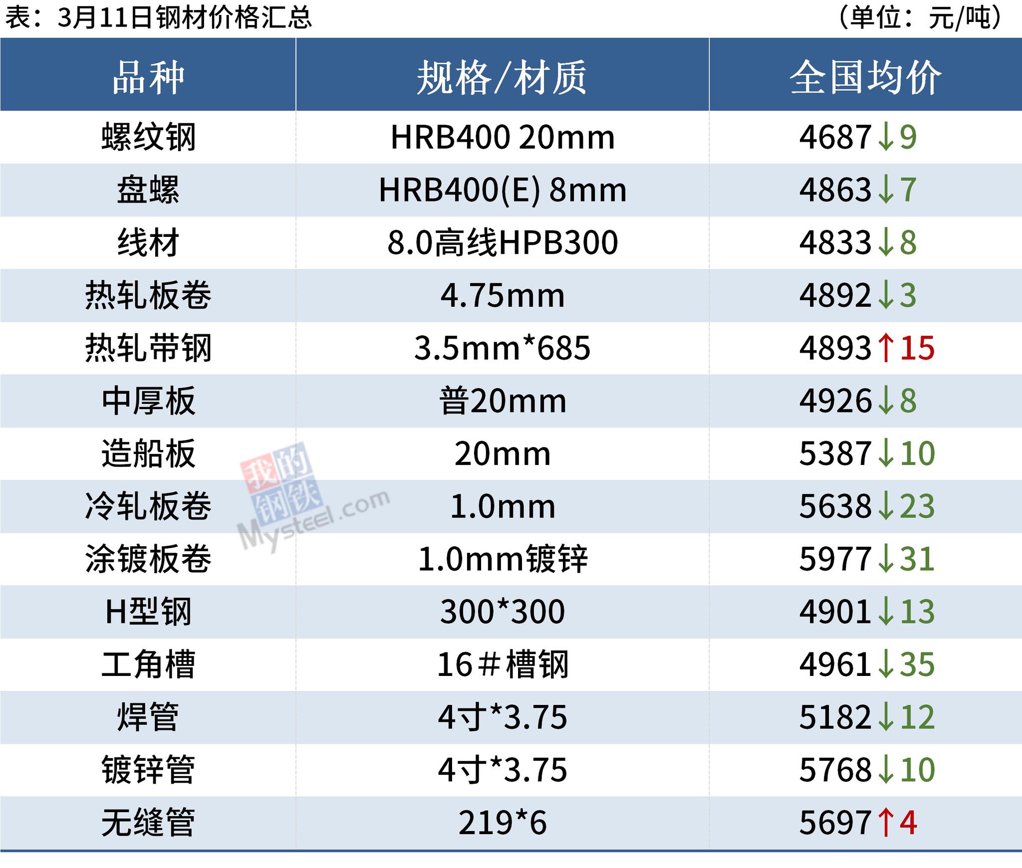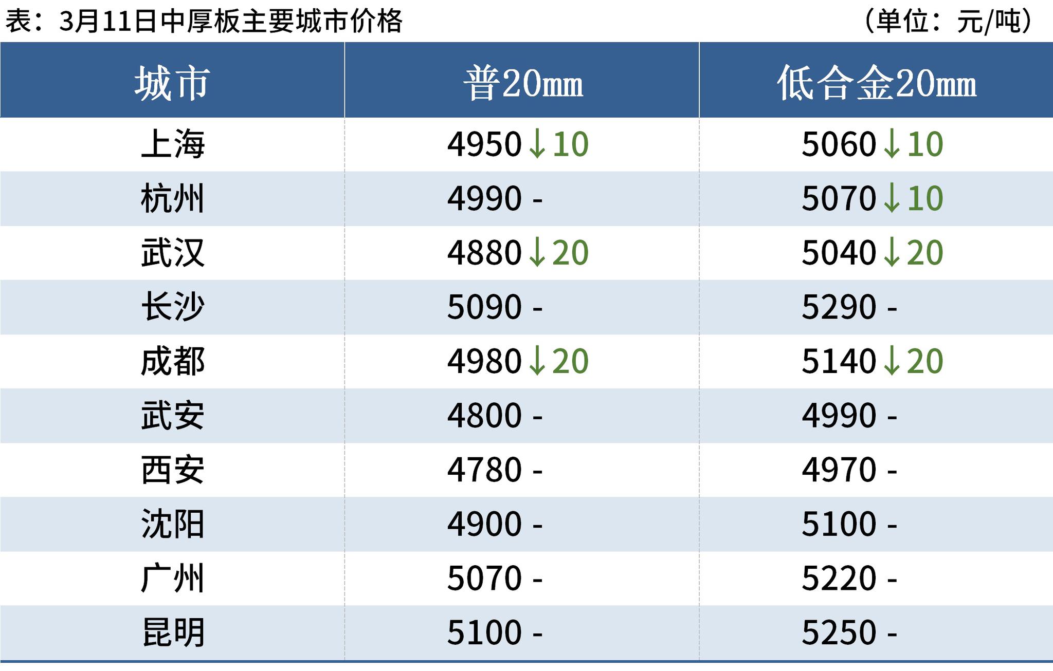 中厚板:3月11日,全国24个主要城市20mm普板均价4926元/吨,较上个交易日价格下跌8元/吨。受托盘资金回笼带来的销售压力,以及原材料价格的回落,导致市场价格继续回落;11日午后,受期市带动,贸易商心态转好,部分地区价格开始回调上涨,成交增加。综合来看,预计短期中厚板价格或将继续平稳运行为主。