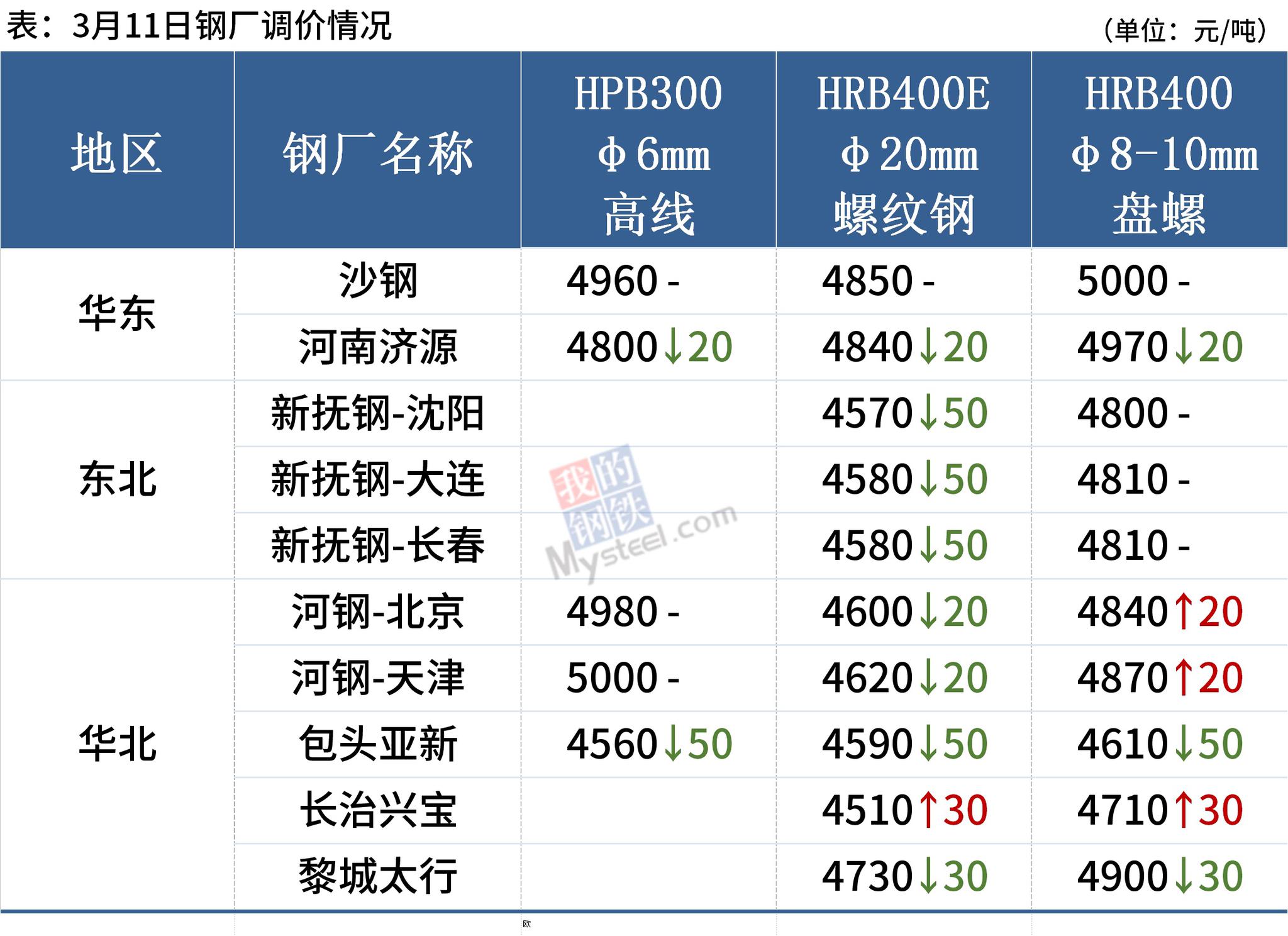 11日,全国7家钢厂发布调价信息,累计调整幅度在0-50元/吨。