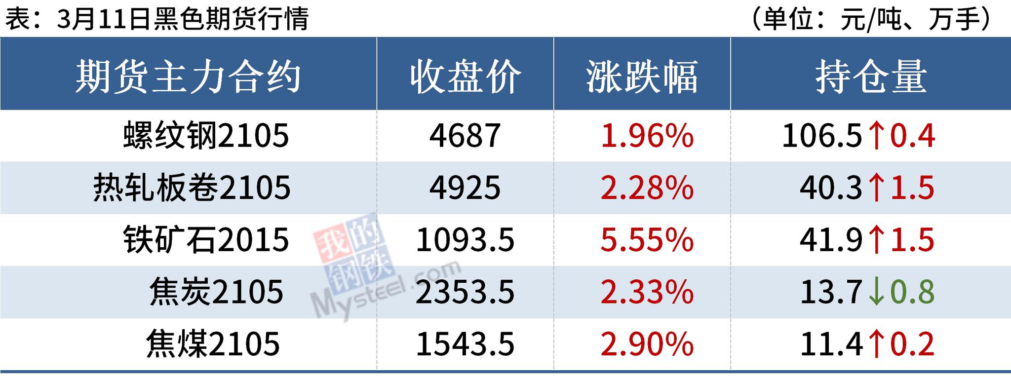 建筑钢材:3月11日,全国25个主要城市20mm三级螺纹钢均价4687元/吨,较上个交易日下跌9元/吨。11日早盘期螺继续走低,但原料期货止跌企稳,上午国内建筑钢材价格局部松动。午后随着期货大幅反弹,多数城市低位资源有回涨情况,且市场投机性需求增加,全天成交有所放量。目前来看,受唐山地区限产影响,本周螺纹钢产量小幅增加,不及预期;建筑钢材社库迎来拐点,且表观消费明显上升,整体基本面向好,同时期货拉涨修复悲观心态,预计短期现货价格或趋强运行为主。