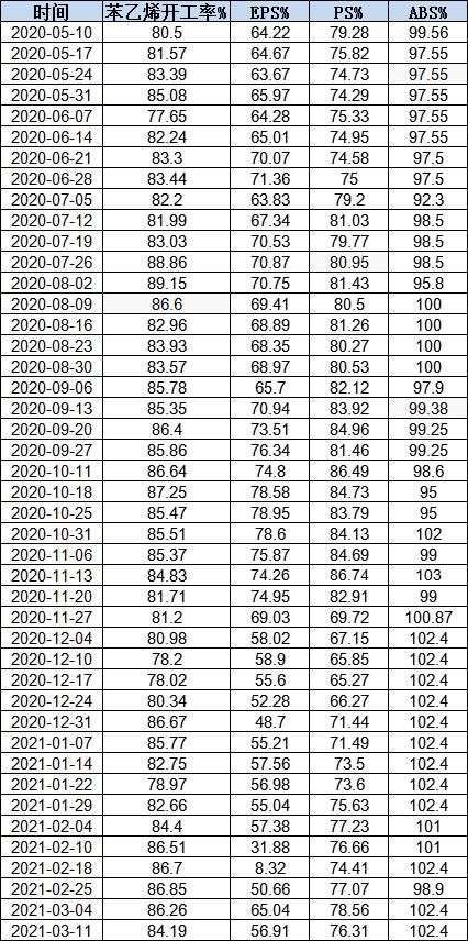 年后苯乙烯受外围装置停车,外盘带动,国内利润大涨,挤压下游利润,主要挤压了EPS和PS,ABS利润下跌后有所回调。三大下游整体维持累库趋势,嘉盛本周负荷继续下降。上周惠州兴达,珠海壬庚,东莞新长桥、海容等停车装置重启,但负荷低位,部分装置因库存高开开停停。