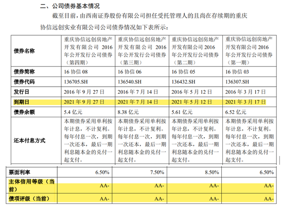 而就在一个月前,协信远创曾发布《信用评级发生变化的公告》:2月8日,联合资信将公司主体及18协信01、16协信03、16协信05、16协信06、16协信08债券的评级,由AA下调至AA-,并列入可能下调评级的观察名单。