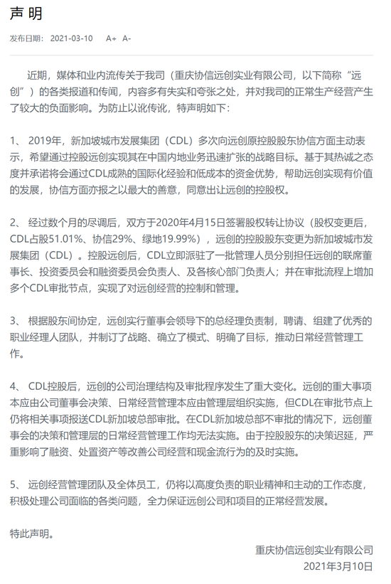 流言纷扰,协信远创终于坐不住了,于3月10日发布了一条声明,《声明》洋洋洒洒700字,但关键点只有两个: