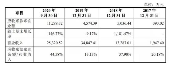 禾赛科技的应收账款也急剧上升,2017年为373.37万元,到2020年上升为1.07亿元,占营业收入比例也从20%左右飙升至44.58%,应收账款账面余额整体呈增长趋势。