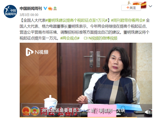 代表董明珠就提议,月度个税起征点应提高到1万元,而不是现在的5千。