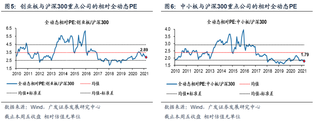 本周创业板与沪深300重点公司的相对全动态PE由上周2.95倍下降到本周2.89倍;中小板与沪深300重点公司的相对全动态PE由上周1.84倍下降到本周1.79倍。