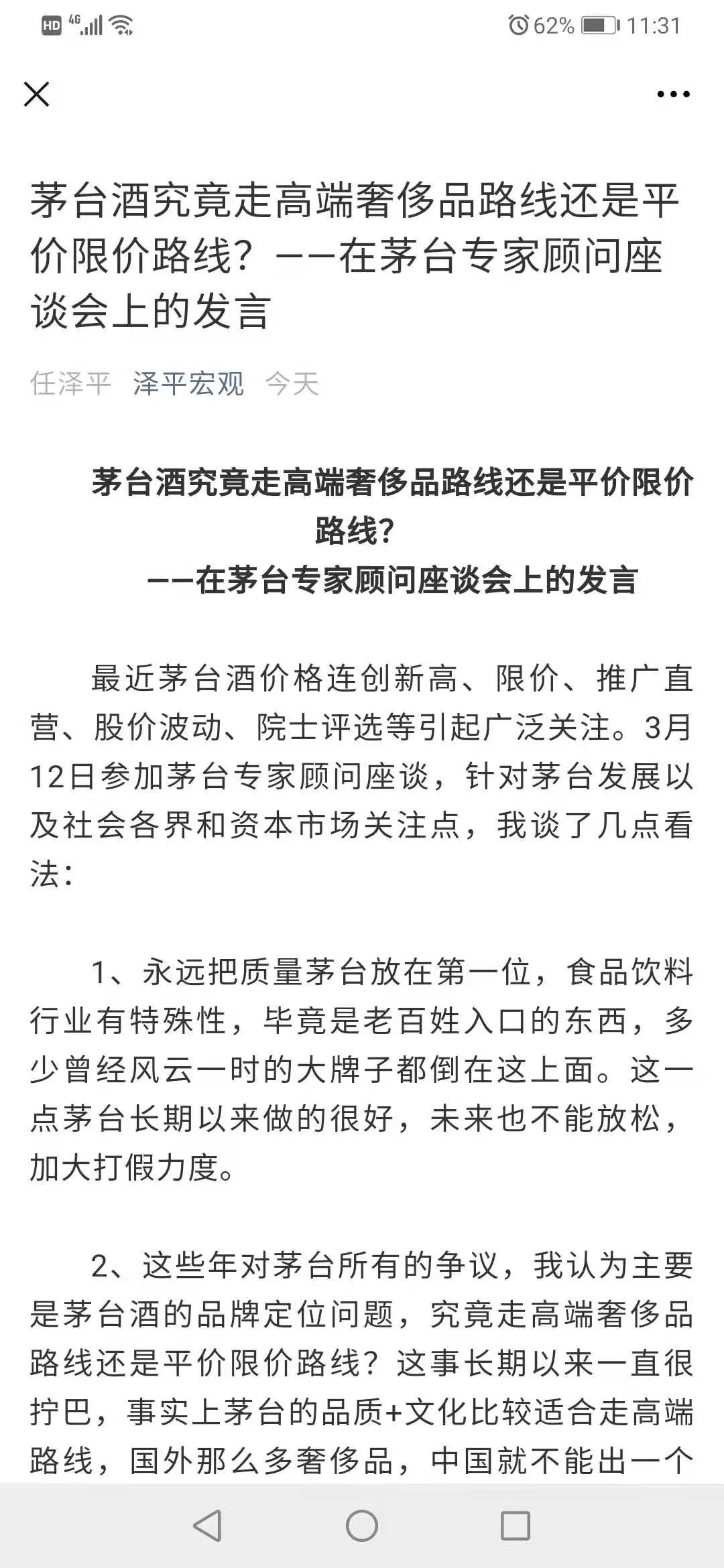 今天,著名经济学家任泽平微信号发了一篇关于茅台专家顾问座谈的内容。最近茅台酒价格连创新高、限价、推广直营、股价波动、院士评选等引起广泛关注。3月12日参加茅台专家顾问座谈,针对茅台发展以及社会各界和资本市场关注点,任泽平谈了以下几点看法。