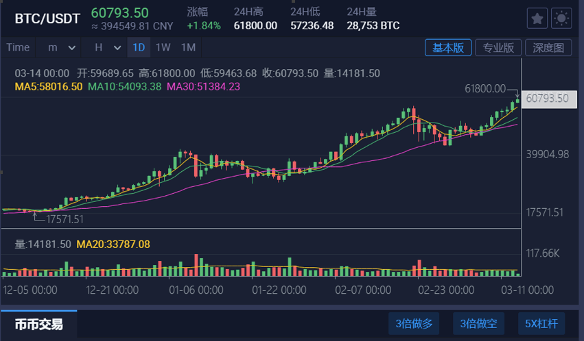疯狂无极限。在经历短暂的调整后,比特币再度开启狂飙之路。截至发稿时间,比特币升至60793.5美元,24小时上涨1.84%,再度刷新历史新高。自此,作为全球数字货币的领头羊,其市值达到惊人的1.28万亿美元,盘中最高达到1.3万亿美元,逼近谷歌的1.39万亿美元。有人吃肉就有人挨打。比特币狂涨让马斯克这些多头赚得盆满钵满,但空头却惨遭血洗。数据显示,近24小时有近10万比特币空头爆仓,最大单笔爆仓超过亿元。