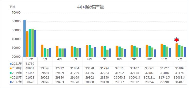 以下为国家统计局公布的2017年以来原煤产量数据:(单位:万吨)