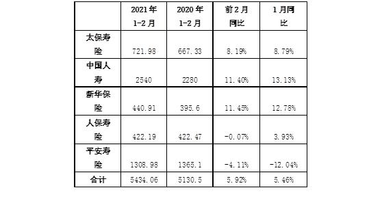 数据显示,2021年1-2月,中国人寿、平安寿险、太保寿险、新华保险、人保寿险分别实现保费收入2540亿元、1308.98亿元、721.98亿元、440.91亿元、422.19亿元,分别同比增长11.4%、-4.11%、8.19%、11.45%、-0.07%。记者统计显示,上述五大上市寿险公司共计实现原保险保费收入5434.06亿元,同比增长5.92%。