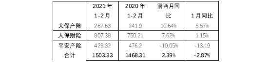 财险“老三家”保费数据显示,2021年1-2月,人保财险、平安财险、太保财险分别实现保费收入807.38亿元、428.32亿元、267.63亿元,分别同比增长7.62%、-10.05%、10.64%,均较1月份同比改善,今年1月份,人保财险、平安财险、太保财险保费同比数据分别为增长1.15%、-13.19%、5.57%。