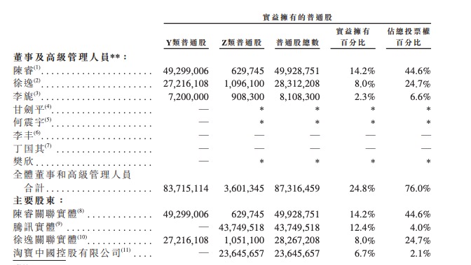 招股书披露了目前B站主要股东的比例和投票权比例。截至2021年1月31日,哔哩哔哩董事长兼CEO陈睿持股14.2%,享有44.6%的投票权;哔哩哔哩创始人兼总裁徐逸持股8.0%,享有24.7%的投票权;副董事长兼COO李旖持股2.3%。腾讯持股12.4%,享有4%的投票权;淘宝中国持股6.7%,享有2.1%的投票权。