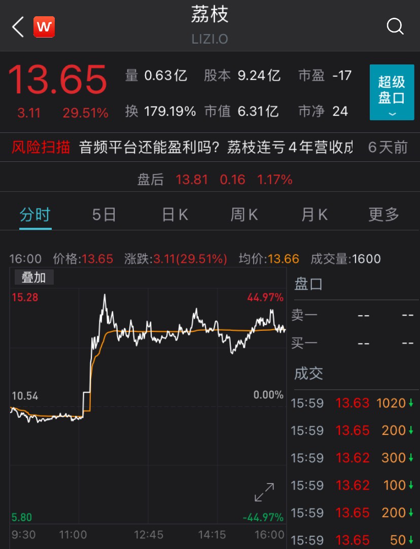 当地时间3月16日,香橼在社交平台上称,作为中国领先的音频平台,荔枝估值较低,并将其目标价定为30美元。消息发出后,荔枝股价直线拉升,触发熔断,盘中一度涨近45%,随后高位震荡。