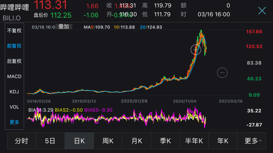 2018年3月28日,B站在纳斯达克上市,发行价11.50美元。根据3月15日的最新收盘价113.31美元,上市三年B站股价翻了近10倍,市值近400亿美元,是同在美股上市的爱奇艺的2倍。