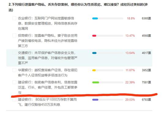 在凤凰网财经发起的315银行调查中,问题2关于“银行泄露客户隐私、丢失存款案例”,投诉量排在选项前两位的皆是中国建设银行。选项“建设银行:倒卖客户信息牟利、信息泄露泛滥,行长、客户经理、外包员工都曾参与”获得7581票,占比22.39%;选项“建设银行:80后女子1000万存款不翼而飞,建行仅赔偿450万及利息”获得6783票,占比20.03%。