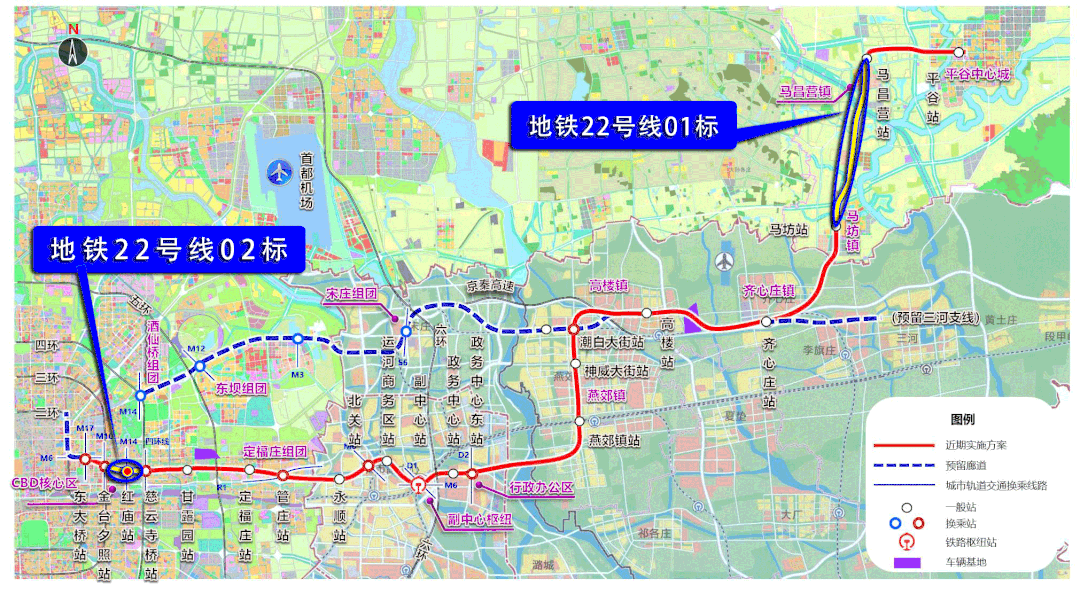 计划中的平谷线(地铁22号)在燕郊北城设置了3个站(高楼站、潮白大街站、神威大街站)、南城设置了1个(燕郊镇站),高峰时段最快27分钟可到北京市区。