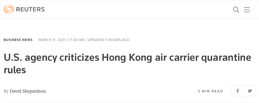 美国运输部声称,香港特区对境外航班的限制让香港的航空公司受益,“损害了美国航空公司的经营权”,“这一划分有效地为国泰航空提供了继续运营的能力,使其不受到新的机组人员检疫要求的影响。”