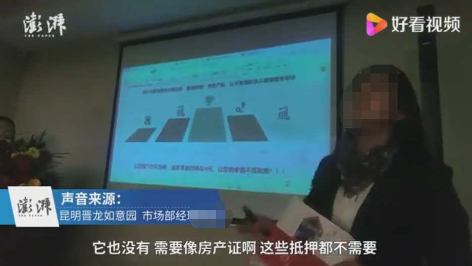 网传视频显示,昆明晋龙如意园的一位市场部经理表示,由于“行业特殊,该业务不需要抵押,信用达得到就可以贷了,客户如果70岁、80岁来购买了,可能就针对他的孙子,可以作为贷款人。”