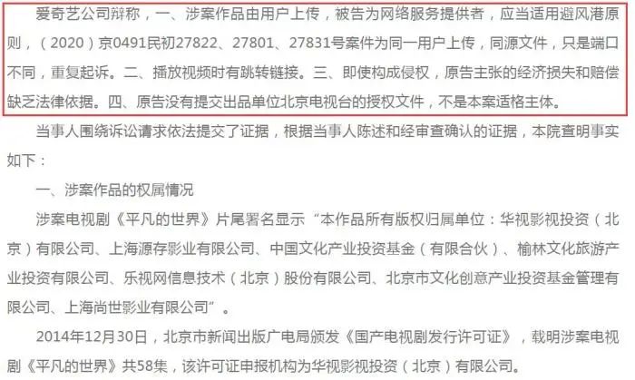 另,裁判日期为2020年12月2日的西藏乐视网信息技术有限公司与北京爱奇艺科技有限公司侵害作品信息网络传播权纠纷一审民事判决书显示,爱奇艺公司辩称,涉案作品由用户上传,被告为网络服务提供者,应当适用避风港原则,多个案件为同一用户上传,同源文件,只是端口不同,重复起诉。