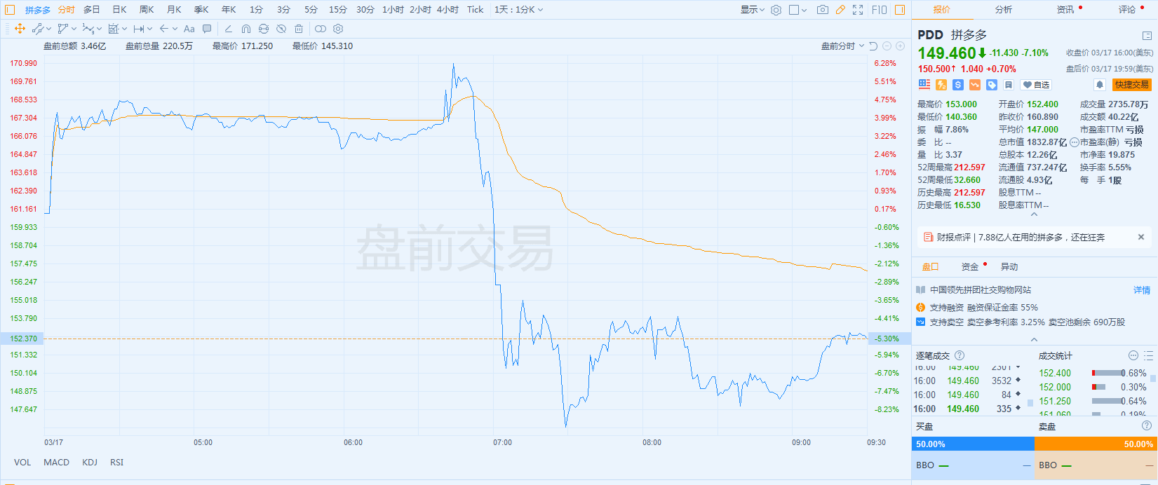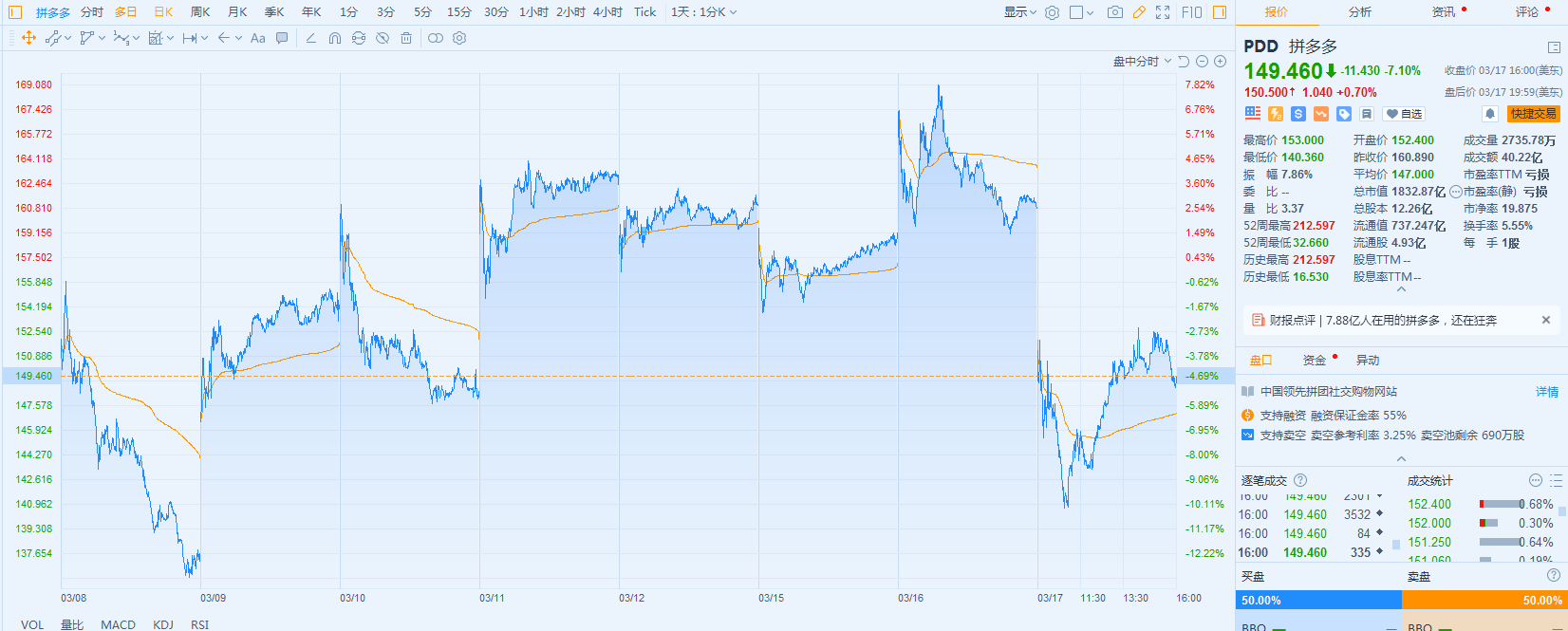 但随后不久,随着黄峥辞任拼多多董事长的消息传出,拼多多盘前股价迅速跳水,开盘后也挡不住跌势,低开低走,盘中一度跌近13%,收跌7.1%。
