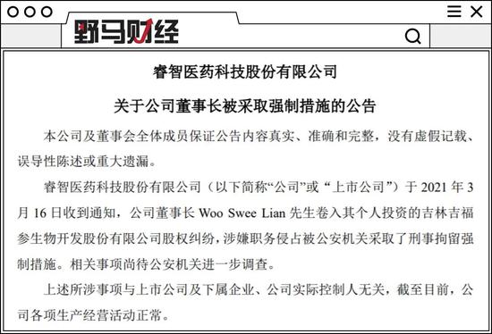 睿智医药(300149.SZ)3月17日发布公告称,公司董事长WooSweeLian(胡瑞连)因卷入其个人投资的吉林吉福参生物开发股份有限公司(以下简称“吉福参”)股权纠纷,涉嫌职务侵占被公安机关采取了刑事拘留强制措施。
