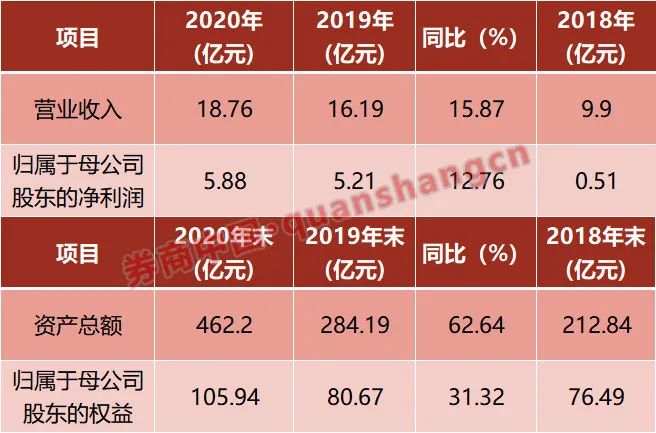 年报数据显示,2020年国联证券营业收入合计为18.76亿元,同比增长15.87%;归属于该公司股东的净利润为5.88亿元,同比增长12.76%。同时得益于A股二次上市,截至2020年底,国联证券总资产达到了462.20亿元,同比增长62.64%;净资产为105.94亿元,较2019年增长31.32%。