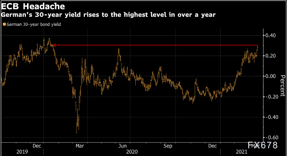 这是一项极其艰巨的任务。30年期德国国债收益率一度攀升5个基点至0.31%,为2020年1月以来高位。拉加德于周四对欧盟议员们称,收益率上升超出了与该地区经济复苏状况相匹配的水平。