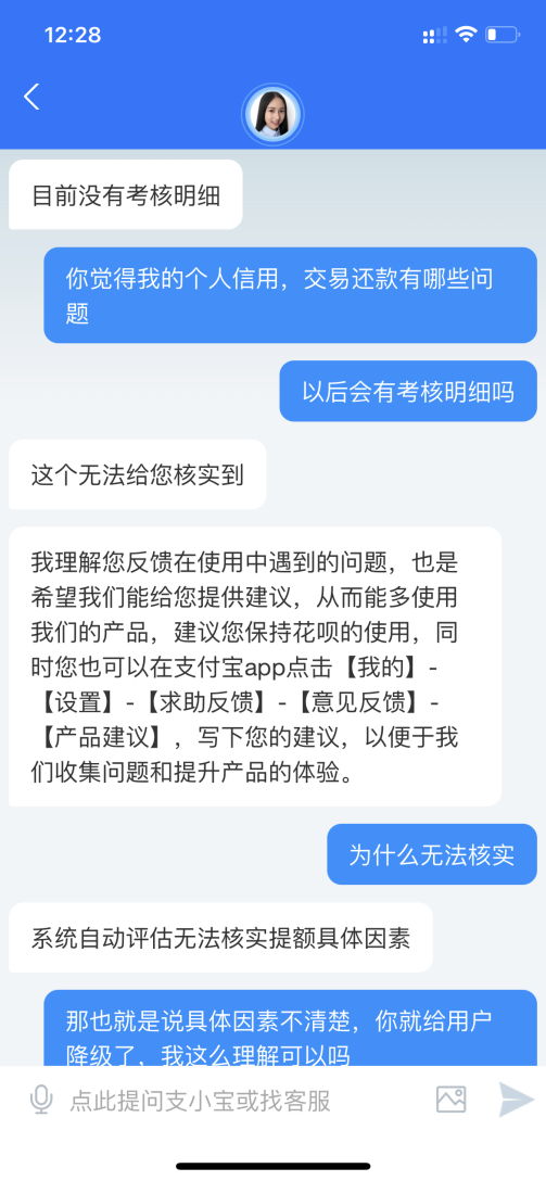 3月18日下午,吴毅就降额情况与支付宝人工客服展开交涉。在此过程中,客服一再表示,“花呗授信会根据还款能力和还款意愿,系统综合评估后动态调整。”而对于吴毅关于评估标准和考核明细等连连追问,客服始终未能给出衡量指标。