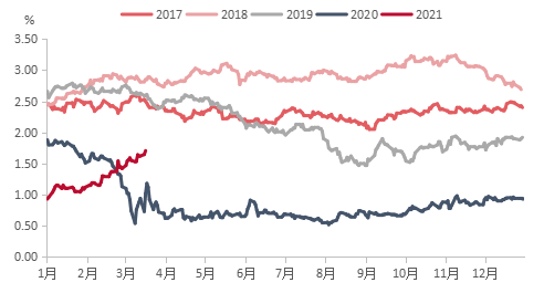 纵览近五年美债收益率走势,2020年开始与过去三年相比较为疲软,但进入今年2月后,美债收益率急剧攀升出现拉涨,源于: