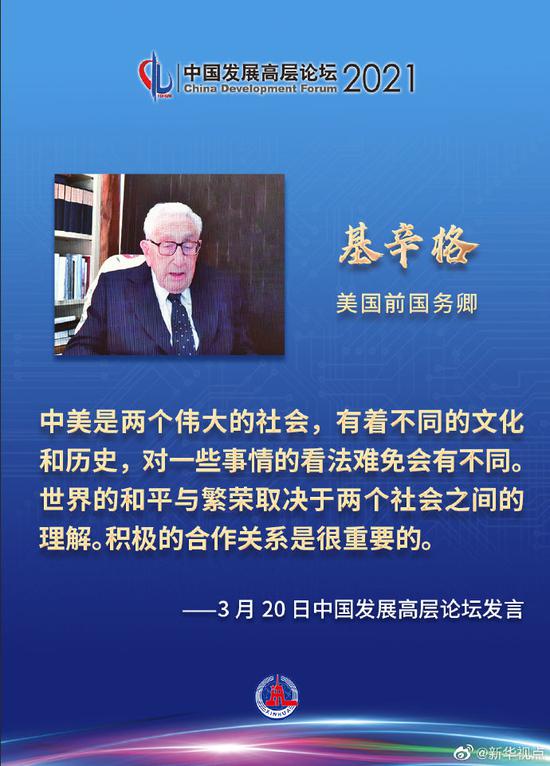 今年恰逢美国前国务卿基辛格首次访华50周年。20日举行的#中国发展高层论坛2021#经济峰会上,基辛格以线上方式出席峰会。他说,50年前,他第一次来到中国,那时的中国无法与今天的中国相比拟,如今中国发展的巨大变化令人难以置信。针对当前中美关系,基辛格表示,中美是两个伟大的国家,有着不同的文化和历史,对一些事情的看法难免会有不同,但现代科技、全球化传播和经济全球化都要求双方付出比以往更大的努力推进合作。世界的和平与繁荣取决于中美之间的理解。积极的合作关系是很重要的。