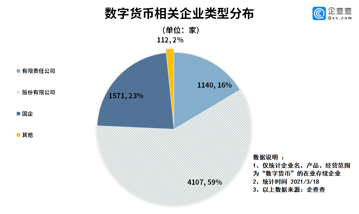 从企业类型分布来看,企查查数据显示,我国数字货币相关的企业中,有59%的企业是股份有限公司,国企占比23%,有限责任公司占比16%,而其他类型的企业占比2%。