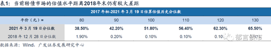 此外,在前期正股的持续回调后,转债市场关心的另一个问题是,当前的情况距离2018年还差多远?从估值中枢历史分位数来看,差距仍然很大。若利用2018年最后一个交易日计算2017年至2021年3月19日的历史分位数,那么各平价对应的估值中枢均处在2%分位点以内,这意味着,当前转债市场的估值水平距离2018年末可以淡化正股行情、利用债底保护大举增配的状态,仍有较大差距。