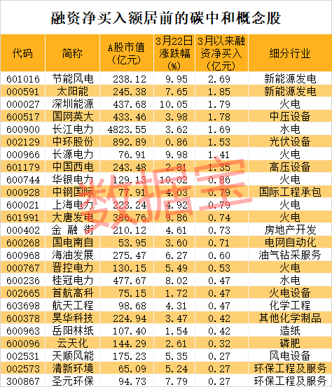 3月以来,碳中和热度持续上升,A股各路资金争相追捧。数据显示,3月以来融资客加仓超亿元的有8只碳中和概念股,包括节能风电、太阳能、深圳能源、国网英大、长江电力、中环股份、长源电力、中国西电等。节能风电融资净买入额最高,达到2.69亿元。另外,根据成交均价粗略计算,北上资金在此期间加仓超亿元的有国电南瑞、中环股份、华测检测、伟星新材、天顺风能等股。