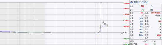 而行权价为16500元吨的沪铝2104看跌期权盘中最高涨幅达到了3000%以上!截至中午收盘,该期权合约涨幅为620%。