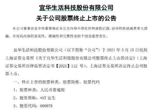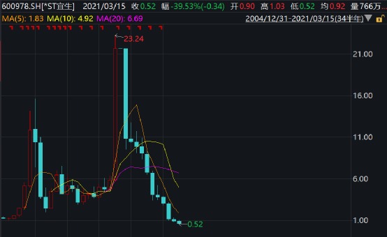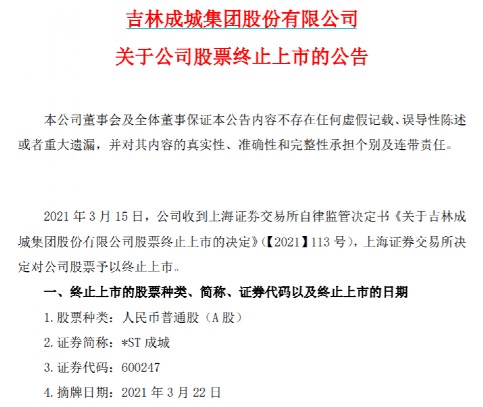 其实早在3月15日晚间,*ST成城、*ST宜生便已发布公告称,由于公司连续20个交易日的每日收盘价均低于1元,上交所决定对公司股票予以终止上市,摘牌日期为3月22日。