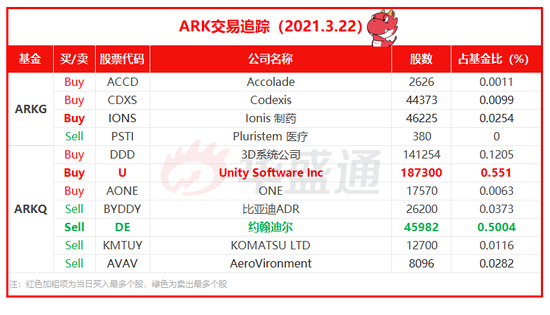 1.ARK三月初建仓的两只股票继续加仓:2D/3D/AR视频游戏公司Unity Software约18.7万股,斥资约1890万美元。Unity3月17日与浙江省水利水电勘测设计院展开合作,为该院实现工程建设管理可视化、数字化提供帮助;加仓3D系统公司约14.1万股,斥资约417万美元,3D系统公司是提供3D打印、机器制造、打印方案的3D一条龙服务公司; 2.医药股方面,加仓Ionis制药约4.6万股,斥资约254.5万美元。Ionis制药专攻RNA基因治疗方法。经过一段时间的持续加仓,Ionis已经成为ARKG基因革命基金里仓位第16的股票; 3.加仓蛋白质工程研究公司Codexis约4.4万股,斥资约97.6万美元。