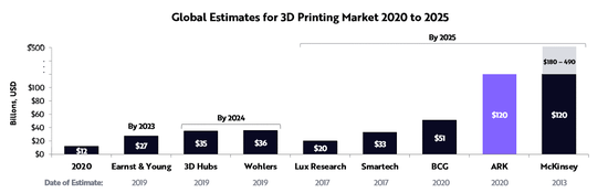 ARK相信,3D打印将给制造业带来一场革命,其年增长率约为60%,即从去年的120亿美元增长到2025年的1200亿美元。在这个领域,ARK预测将有长期的成长机遇。